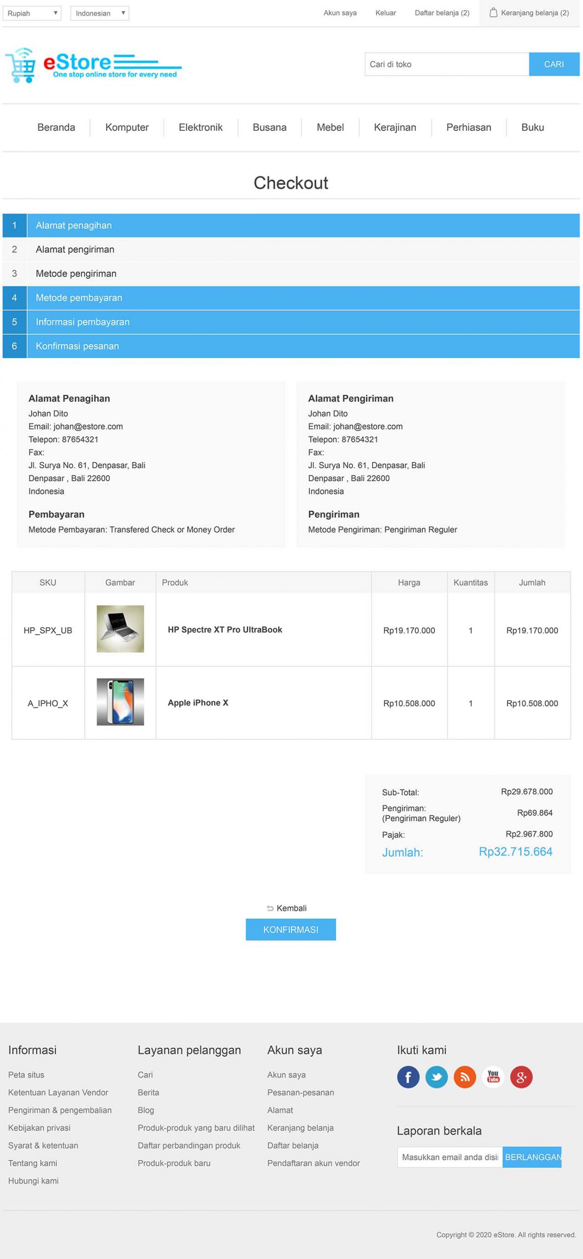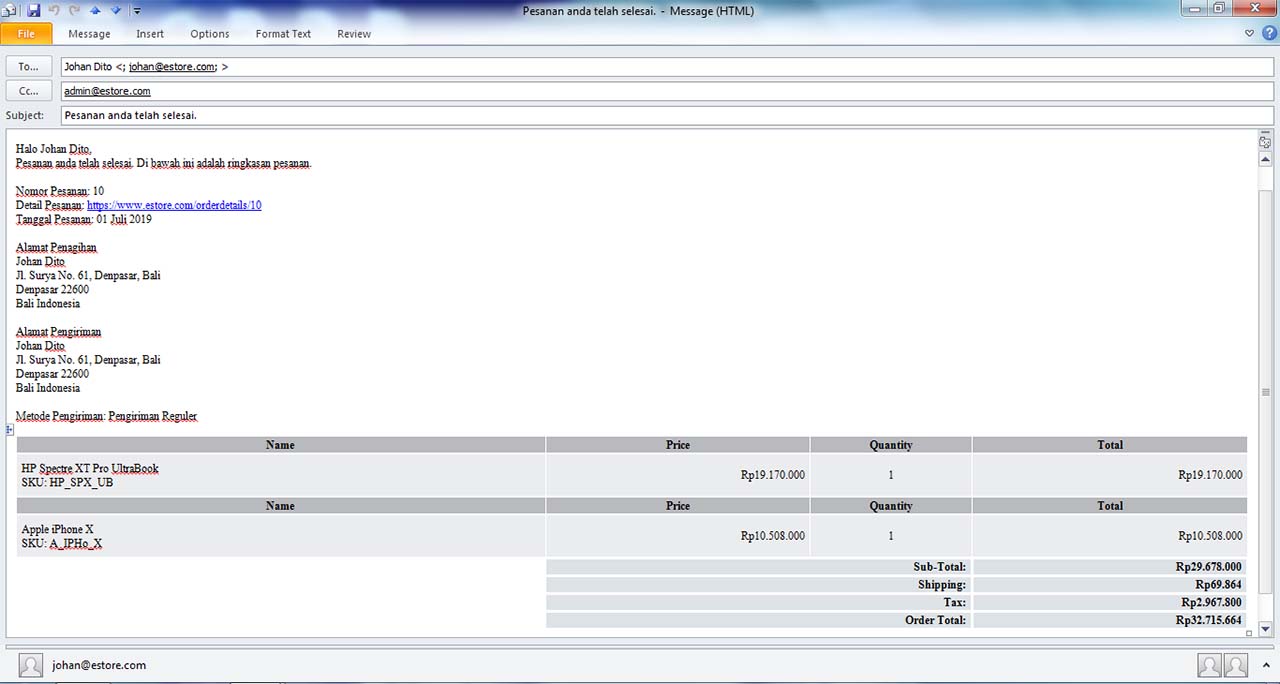 Menghitung secara otomatis jumlah total belanja, berdasarkan harga, kuantitas, ongkos pengiriman dan pajak. - Pemberitahuan status.